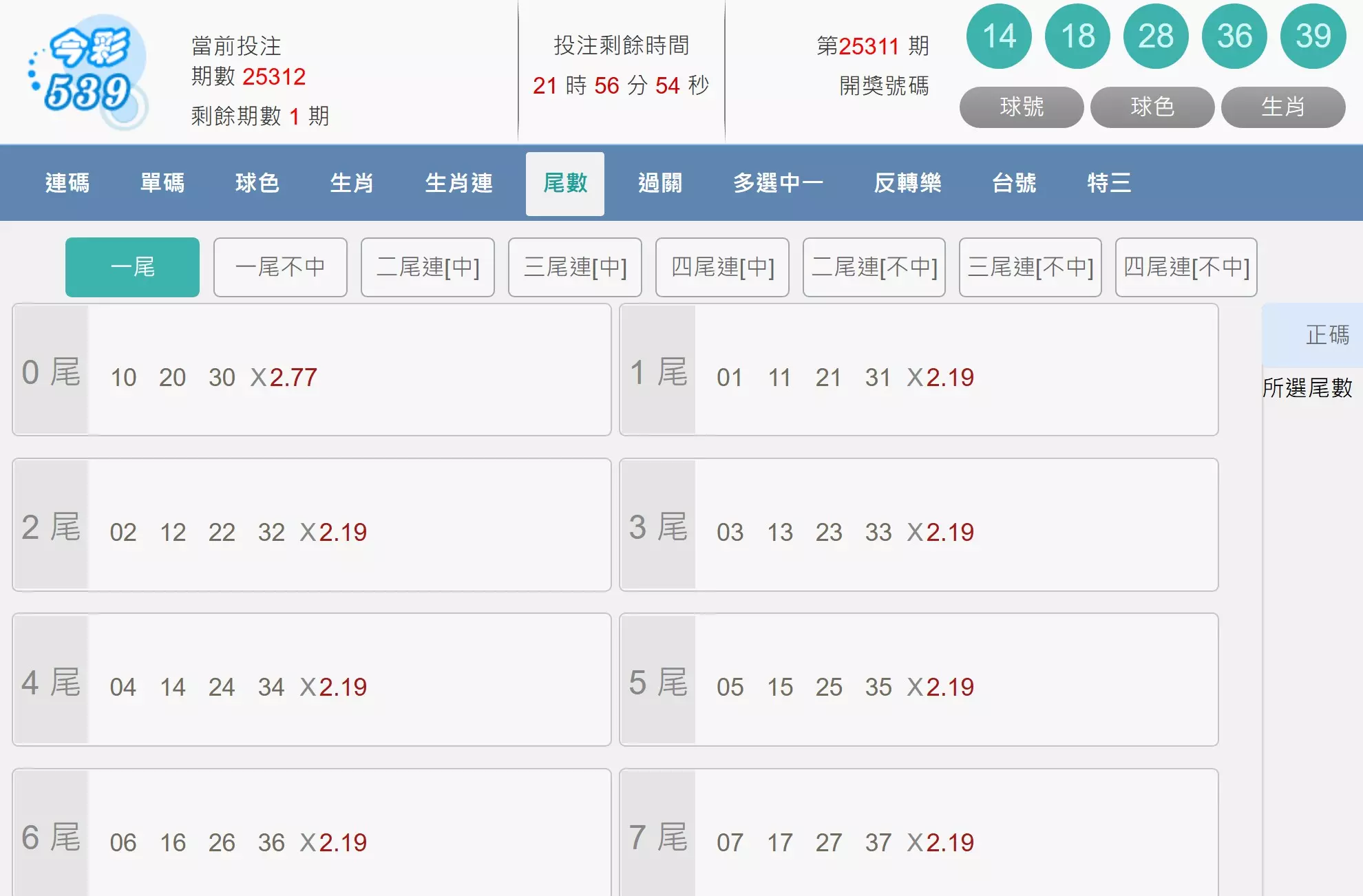 今彩539還有一種特別的玩法是下注「尾數」,也就是看開獎號碼的個位數結尾。