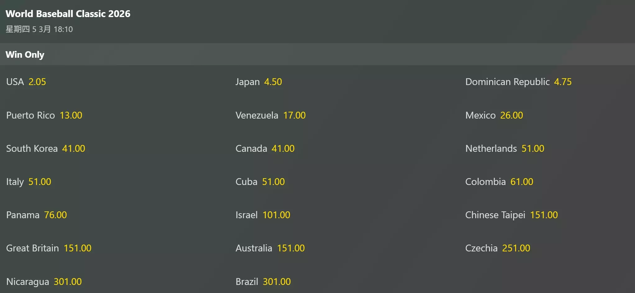 說實話,每次看到中華隊的賠率偏高,身為台灣球迷一定會有點不是滋味。但換個角度想,其實這也反映了目前國際對我們整體戰力的觀感。當然,我們也不是沒料子,只是整體球員大多在中華職棒或業餘層級,國際賽經驗跟MLB或NPB級別的球員相比,還是有落差。